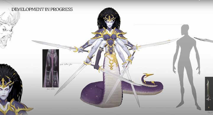 Dechala, niegdyś księżniczka Wysokich Elfów, została skażona przez boga rozkoszy i dekadencji, co doprowadziło do jej groteskowej mutacji. Obecnie posiada sześć ramion uzbrojonych w śmiercionośne miecze oraz wężowe ciało zakończone trującym żądłem (powyżej możecie zapoznać się z jej wstępnym projektem). Na polu bitwy wyróżniać będzie się szybkością i umiejętnością skutecznego flankowania wrogów. Jej frakcja otrzyma nowe jednostki, w tym czteroramiennych czempionów Slaanesha oraz demoniczną kawalerię Pleasure Seekers, dosiadającą potężnych, wężowych rumaków.