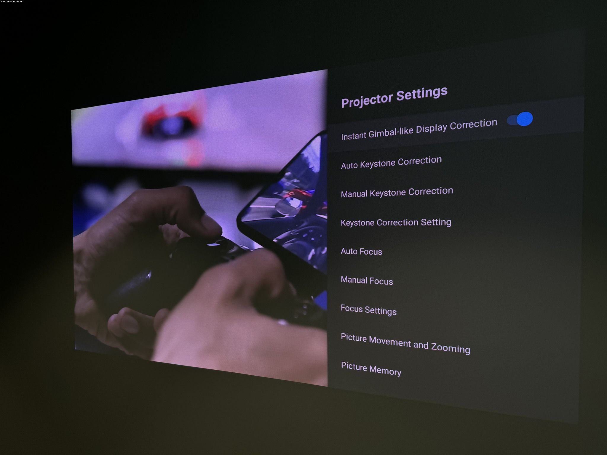 Jedną z najciekawszych funkcji i największych zalet projektora jest automatyka związana z dostosowywaniem obrazu. Wystarczy, że podłączymy urządzenie do zasilania, uruchomimy i właściwie nie będziemy musieli nic więcej konfigurować w zakresie obrazu.