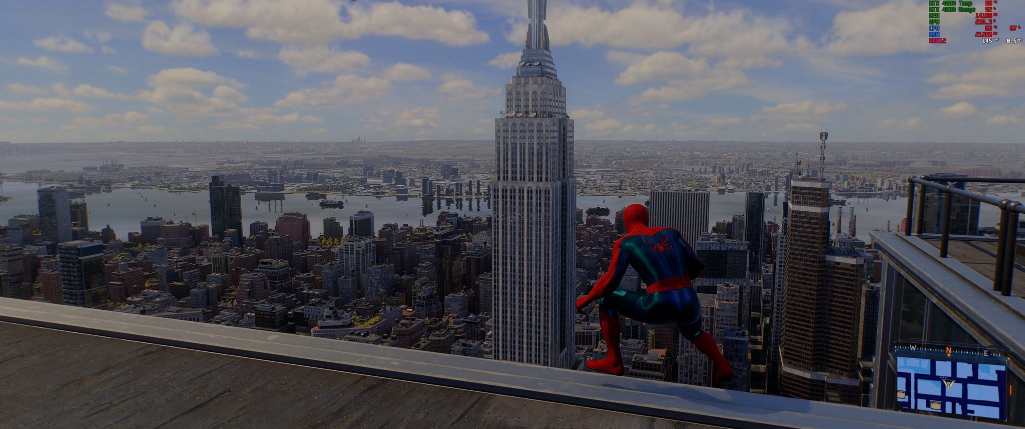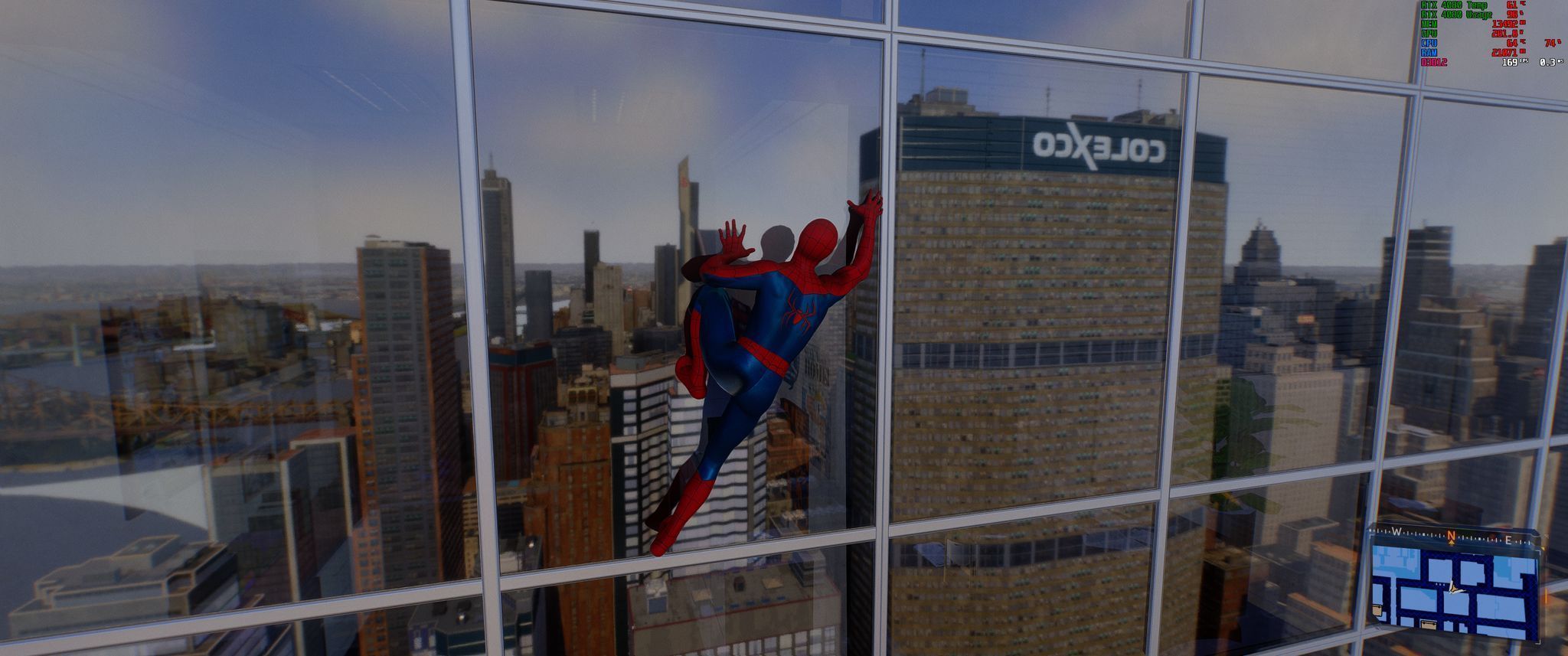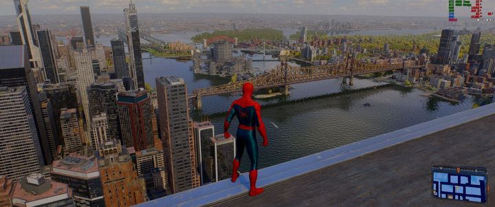 Z włączonym DLSS frame generation, mój pecet osiągał średnio około 120 klatek na sekundę w bardziej zatłoczonych miejscówkach i ponad 140 fpsów podczas zwiedzania dachów budynków czy podziwiania widoków Nowego Jorku.