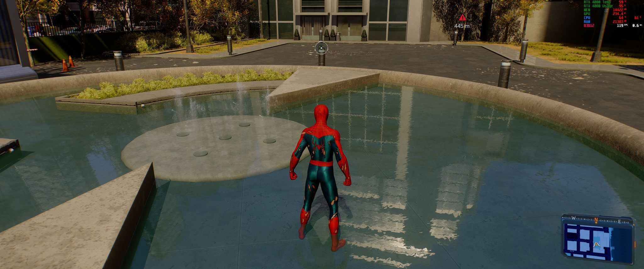 Po ustawieniu wszystkiego, co się da na ultra, włączeniu ray tracingu na maksa, włączeniu ray reconstruction w trybie transformer (lepszym, ładniejszym, bardziej obciążającym kartę graficzną) i DLSS w trybie zrównoważonym, na moim komputerze Marvel's Spider-Man 2 działał średnio w mniej więcej 62 klatkach na sekundę podczas bujania się na sieciach po mniej wymagających lokacjach (wyżej, ponad poziomem ulicy). Wszystko to w rozdzielczości 3440 na 1440 pikseli.