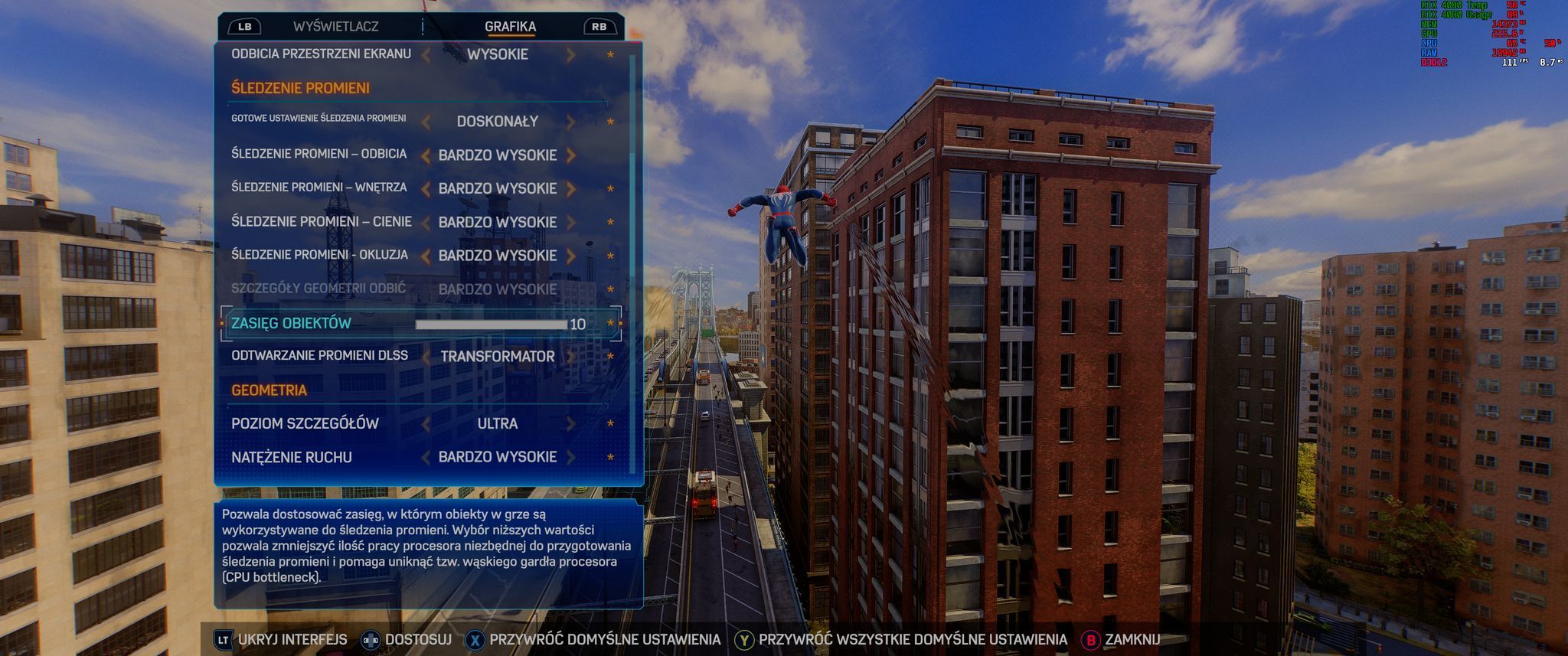 Czemu Marvel's Spider-Man 2 działa tak kiepsko na ultra, na bardzo mocnym sprzęcie? Gra na tych ustawieniach wykorzystuje miejscami ponad 80% zasobów mojego procesora i, jak możecie zauważyć na załączonym obrazku, nawet mniej niż 80% mocy karty graficznej. To klasyczny przypadek bottlenecka ze strony CPU i dość kiepskiej optymalizacji efektów ray tracingu. Udało mi się jednak temu jakoś zaradzić, bowiem zmniejszenie opcji „zasięg obiektów” z 10 na 6 pozwoliło uzyskać niemal idealnie płynne 60 klatek na sekundę, nawet na ulicy, a spadki poniżej tej wartości są dużo rzadsze.