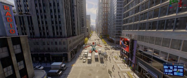 Wersja pecetowa ma trochę większą gęstość samochodów i ludzi na ulicy, ma trochę lepiej wyglądającą wodę i dłuższy zasięg rysowania. Podczas bujania się na sieciach widać, że obiekty nie doczytują się tak blisko, jak na PS5 Pro, a tekstury są nieco lepsze, ale to przecież nie jest coś, co psułoby doświadczenia z rozgrywki.