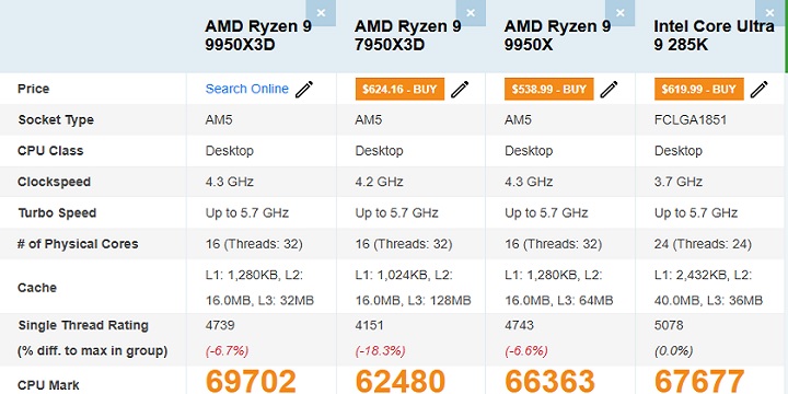 Już niedługo na rynku mają zadebiutować nowe procesory od AMD, Ryzeny 9 9950X3D i 9900X3D. Pierwszy raz zostały one zaprezentowane na targach CES na początku roku. Niestety do tej pory otrzymaliśmy niewiele potwierdzonych informacji dotyczących ich wydajności. Jednak w sieci od jakiegoś czasu pojawiają się przecieki na ten temat. Wczoraj, Ryzen 9 9950X3D został dostrzeżony w bazie danych benchmarku PassMark. Uzyskane przez niego wyniki wskazują, że procesor może zaoferować jeszcze lepszą wydajność od swojego poprzednika Ryzena 7950X3D, niż wcześniej sądzono.
