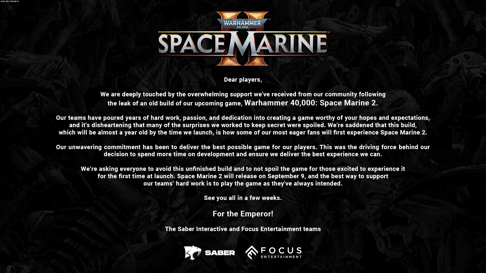 Nasze zespoły włożyły lata ciężkiej pracy, pasji i poświęcenia w stworzenie gry godnej Waszych nadziei i oczekiwań, przez co przygnębiającym jest fakt, że wiele niespodzianek, które staraliśmy się zachować w tajemnicy, zostało zepsutych. Jesteśmy zasmuceni, że za sprawą tej wersji, która w momencie premiery gry będzie miała prawie rok, niektórzy z naszych fanów po raz pierwszy zetkną się ze Space Marine 2.