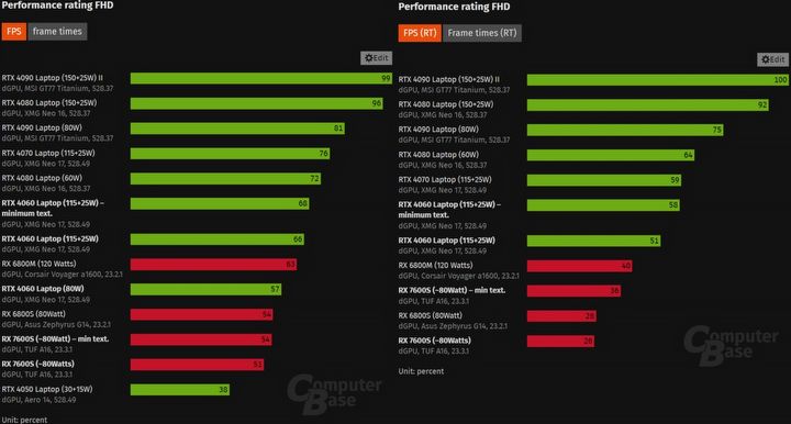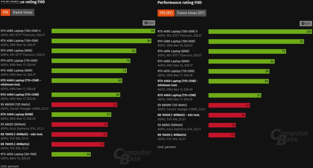 Radeon RX 7600S w testach porównywany był z mobilnym GeForcem RTX 4060. Jego teoretyczne, maksymalne TGP wynosi 140 W, choć realnie były to okolice 103 W, zatem wyraźnie więcej niż 83 W w przypadku Radeona. Zegary dla obu GPU wynosiły odpowiednio 2612 MHz dla RTX i 2446 MHz dla RX.
