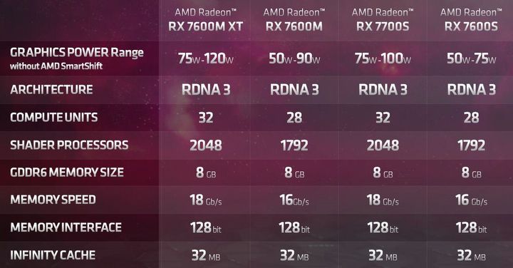 Radeon RX 7600S na papierze może nie imponować specyfikacją. Wyraźnie widać, że mamy do czynienia z kartą z niższego segmentu wydajności. Procesor Navi 33 wyposażony w 28 jednostek obliczeniowych będzie współpracował z 8 GB pamięci VRAM na 128-bitowej szynie, do tego interfejs PCIe 4. generacji z zaledwie 8-ma liniami.