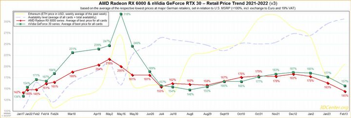 Jak wyliczono, obecnie jednostki GeForce RTX 3000 kosztują średnio 157% sugerowanej ceny detalicznej. Daje to 20% różnicy w porównaniu z sytuacją z 23 stycznia. W przypadku Radeonów RX 6000 mowa o cenie na poziomie 145% sugerowanej kwoty, co przekłada się na 18% spadek w porównaniu z zeszłym miesiącem.