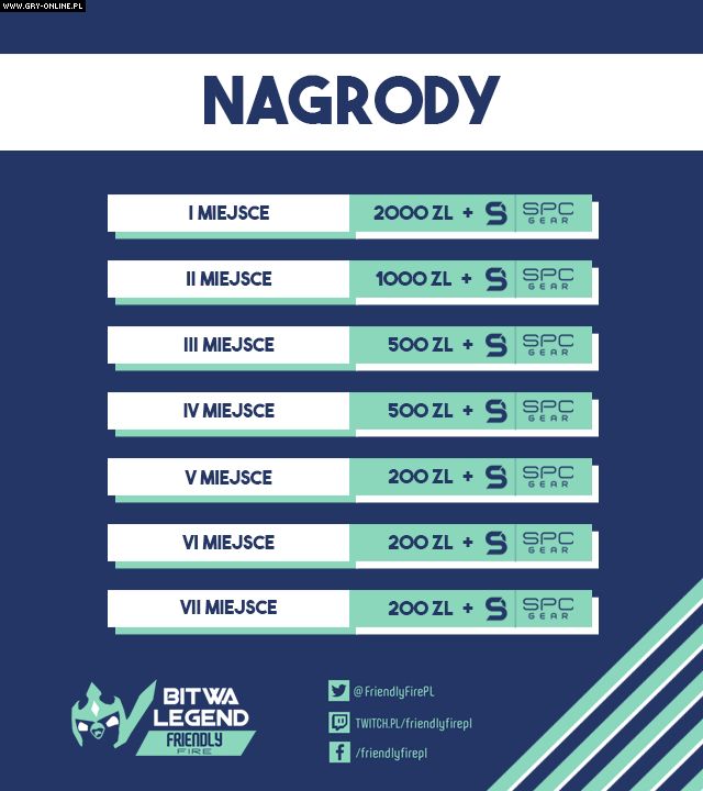 Dla zwycięzców Bitwy Legend Friendly Fire czekają nagrody pieniężne! Dodatkowo laureaci zostaną nagrodzeni zestawami sprzętowymi od SPC Gear, składającymi się m.in. z gamingowego fotela, myszy oraz klawiatury.