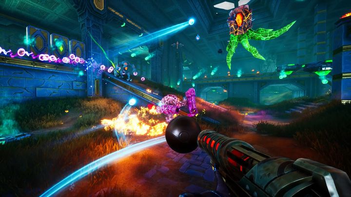 W ramach przypomnienia – Afterblast to FPS z elementami roguelite’a, w którym wcielamy się w bohatera przemierzającego losowo generowane plansze, zdobywającego rozmaite moce i bronie oraz mierzącego się przy tym z hordami przeciwników. Rozgrywka stawia na szybkie tempo i widowiskową eliminację wrogów inspirowaną nowymi odsłonami Dooma, ale – paradoksalnie – w bardziej kolorowej oprawie.