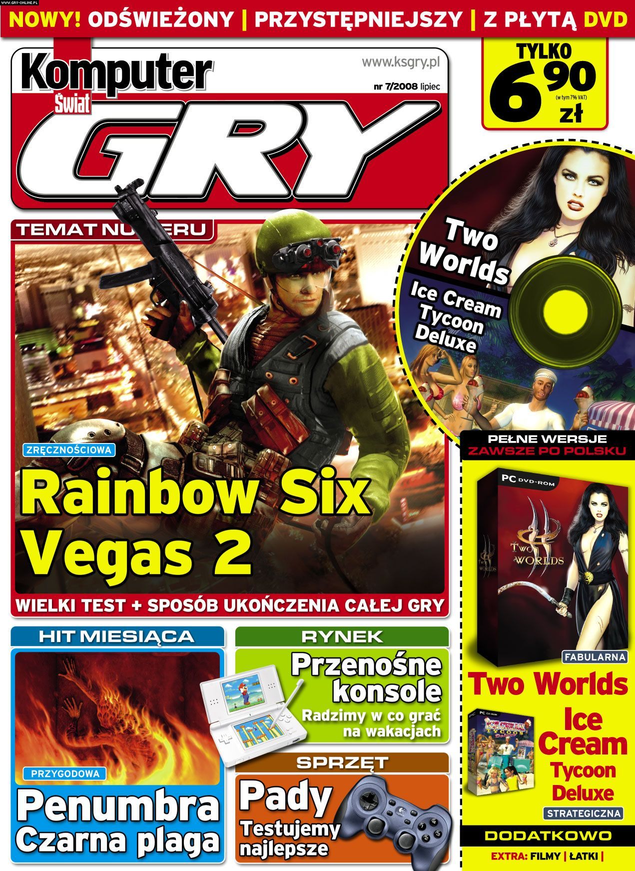 Już od dziś w sprzedaży jest najnowszy numer magazynu Komputer Świat GRY (7/08) z pełną wersją fantastycznej i świetnie przyjętej na całym świecie gry fabularnej Two Worlds PL oraz strategii ekonomicznej Ice Cream Tycoon Deluxe PL. Tematem numeru jest gra Rainbow Six Vegas 2, do której przygotowaliśmy także obszerny poradnik. W piśmie zamieściliśmy także opis przejścia Penumbry: Czarna Plaga. Cena
