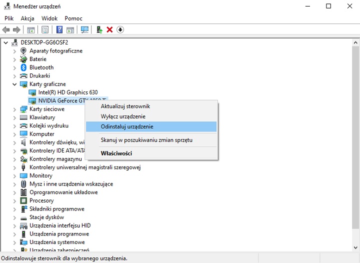 Odinstalowanie i ponowne zainstalowanie karty graficznej to jeden ze sposobów na naprawę problemu z optymalizacją gier w aplikacji Nvidia. Źródło: własne.