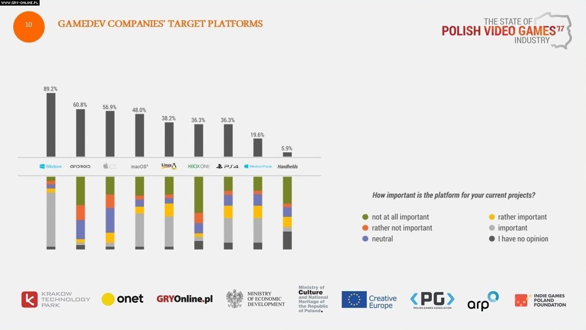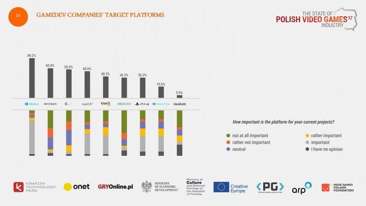 Ponieważ większość polskich firm deweloperskich to małe studia, nie dziwi, że 89,2% tworzonych w Polsce gier trafia na PC. Sporo jest też tytułów przeznaczonych na platformy mobilne (60,8% Android, 56,9% iOS). Polscy deweloperzy nie zaniedbują też posiadaczy Maców (48%) i Linuksów (38,2%). Dopiero dalej w kolejności są wiodące konsole Xbox One i PlayStation 4 (po 36,3%). Na szarym końcu, za Windows Phone (19,6%), znalazły się handheldy (5,9%).