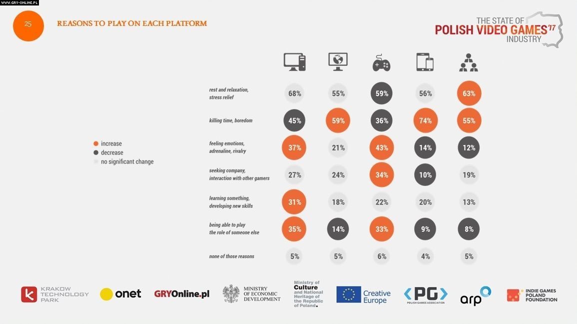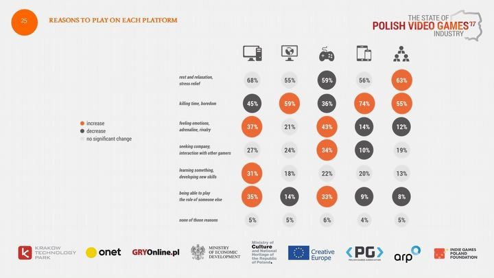 Z kolei potrzeba rozrywki i odstresowania się jest kluczowa dla użytkowników wszystkich platform, w szczególności pecetów. Pozostałe powody – w tym chęć rywalizacji, potrzeba towarzystwa, pragnienie nauczenia się czegoś nowego czy odgrywanie roli – były wskazywane rzadziej.