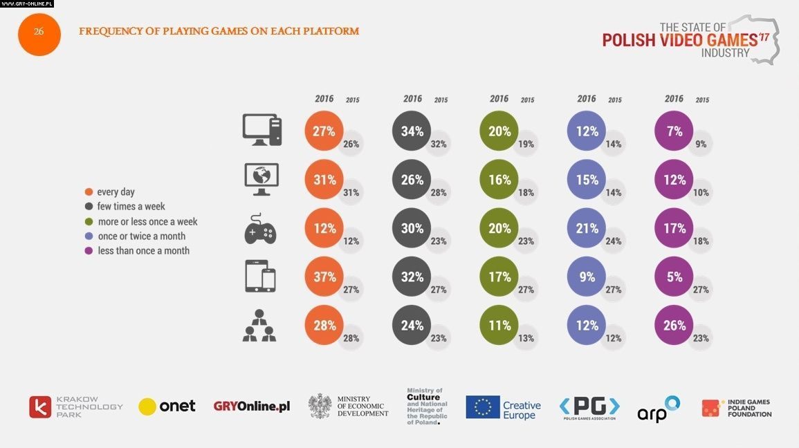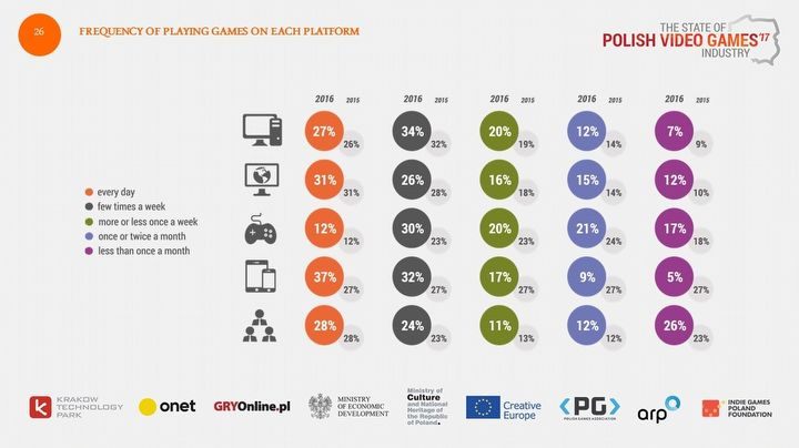 Grupa tzw. graczy „hardkorowych”, czyli pecetowcy i konsolowcy, z reguły gra kilka razy w tygodniu (odpowiednio 34% i 30%). Podczas gdy wielu pecetowcom zdarza się sięgać po tego typu rozrywkę jeszcze częściej, to codziennie gra zaledwie 12% graczy konsolowych. Największy odsetek grających każdego dnia mają urządzenia mobilne (37%), co jest zrozumiałe, jako że gry tego typu z łatwością można uruchomić nawet na kilka minut, będąc w dowolnym miejscu.