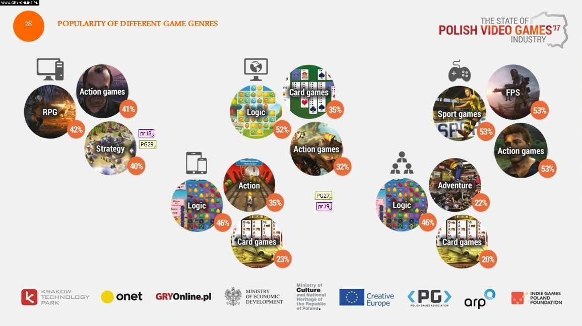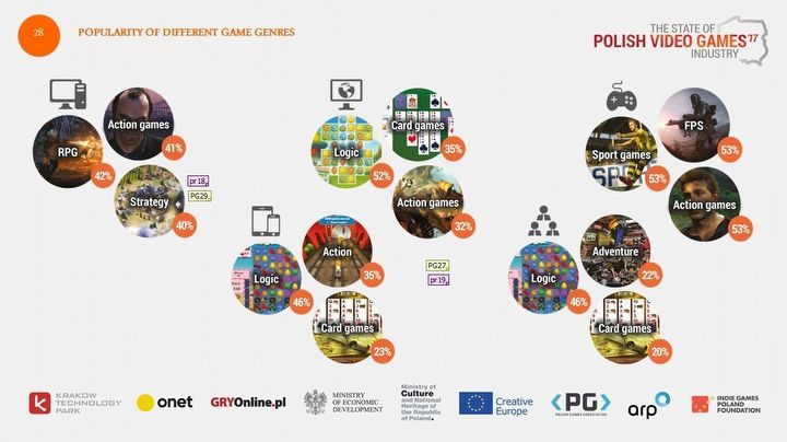 Wygląda na to, że ulubionym gatunkiem wśród polskich graczy są gry akcji – wskazali na nie użytkownicy pecetów, konsol, urządzeń mobilnych oraz fani tytułów przeglądarkowych. Oprócz tego pecetowcy uwielbiają jeszcze RPG-i i strategie, a konsolowcy gry sportowe i FPS-y. Z kolei na tabletach i smartfonach często gramy też w produkcje logiczne oraz karcianki.