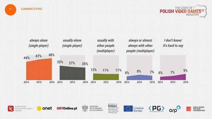 Wśród Polaków utrzymuje się tendencja do grania w pojedynkę. Spośród ankietowanych największą grupę stanowiły osoby grające zawsze samemu (48%), podczas gdy bawiący się najczęściej lub prawie zawsze z innymi to jedynie 18% całości. Jeśli chodzi o style grania, od paru lat dane te nie ulegają większym zmianom: najbardziej zauważalny jest jedynie spadek procentowy liczby grających zazwyczaj w pojedynkę do 25% z 32% w 2014 roku – zamiast tego pojawiło się nieco więcej całkowitych samotników oraz osób, którym trudno ocenić swój styl grania. Oczywiście najwięcej samotnych wilków można znaleźć wśród graczy mobilnych (89%), co spowodowane jest faktem, że rynek zdominowały produkcje singleplayerowe.