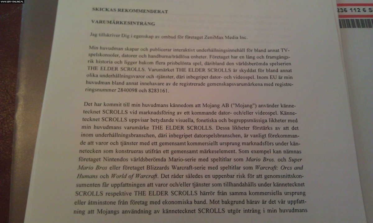 Markę Scrolls, studio Mojang zarejestrowało pół roku temu. Jakiś czas po tym, prawnicy Bethesdy skontaktowali się ze szwedzkim zespołem chcąc dowiedzieć się więcej o Scrolls i zwrócić uwagę na fakt, iż taka nazwa może stanowić pewien problem. Kilka dni temu natomiast, Notch otrzymał 15-stronicowy list, w którym prawnicy otwarcie żądają od Szwedów zaprzestania używania nazwy Scrolls oraz pokaźnej sumy pieniędzy.