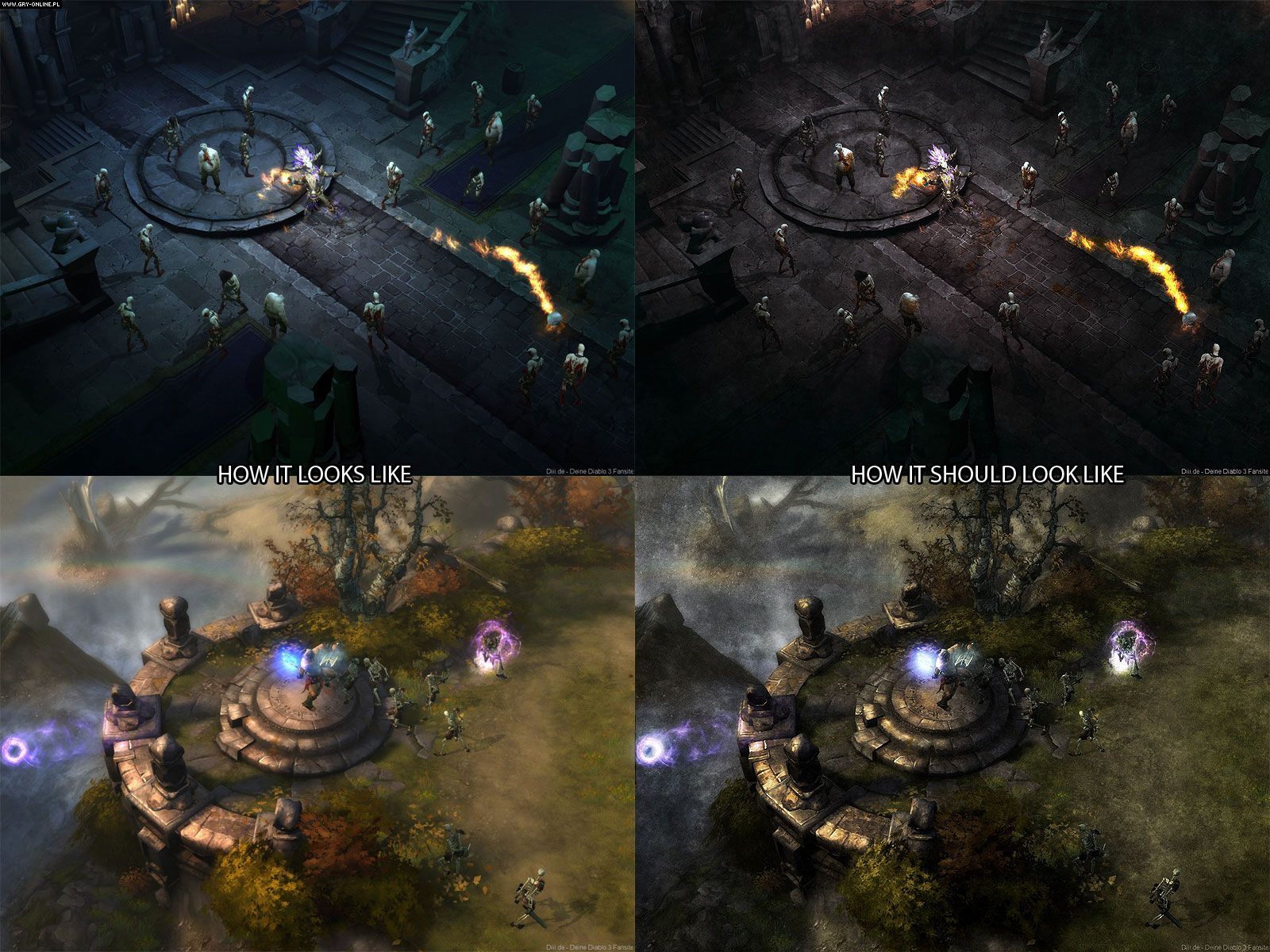 Chociaż oprawa graficzna Diablo III prezentuje się bardzo dobrze, wielu fanom serii nie przypadła do gustu. W sieci możemy znaleźć nawet petycję skierowaną do Blizzarda z prośbą o zmiany w tym aspekcie. Głównymi zarzutami pod adresem trójki są kreskówkowa stylistyka środowiska i postaci, przypominająca raczej świat Warcrafta niż starsze części Diablo, kolorowe, pełne roślin lasy, oraz zbyt duże, nierealistyczne elementy uzbrojenia. Według ludzi, którzy petycję napisali w poprzednich odsłonach mieliśmy do czynienia z gotyckim klimatem i realistycznie przedstawianym światem. Poniżej kilka zmodyfikowanych przez fanów screenshotów pokazujących, w jakim kierunku powinna pójść ekipa Blizzarda:
