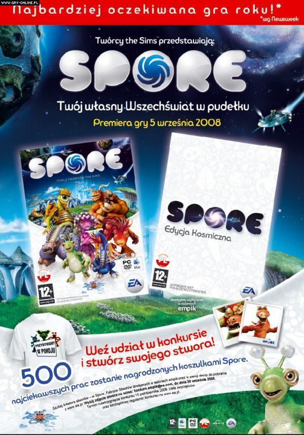 Stwórz jedynego w swoim rodzaju stworka za pomocą kreatora stworów w grze SPORE, bądź przy użyciu wersji próbnej (do pobrania za darmo na stronie www.spore.com) i wyślij go na adres [email protected]. 500 najciekawszych prac zostanie nagrodzonych koszulkami SPORE! Wielkie rozstrzygnięcie konkursu nastąpi 15 października.