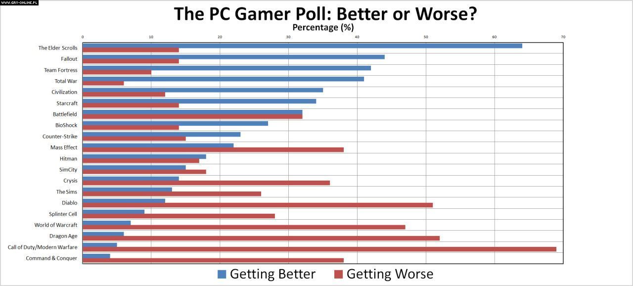 Serwis PC Gamer przeprowadził ostatnio ankietę: Jakie marki gier stają się coraz lepsze, a jakie coraz gorsze? Gracze mogli określić, które z 20 popularnych serii gier rozwijają się w dobrym kierunku, a które w złym. Wyniki mogą Was zainteresować.