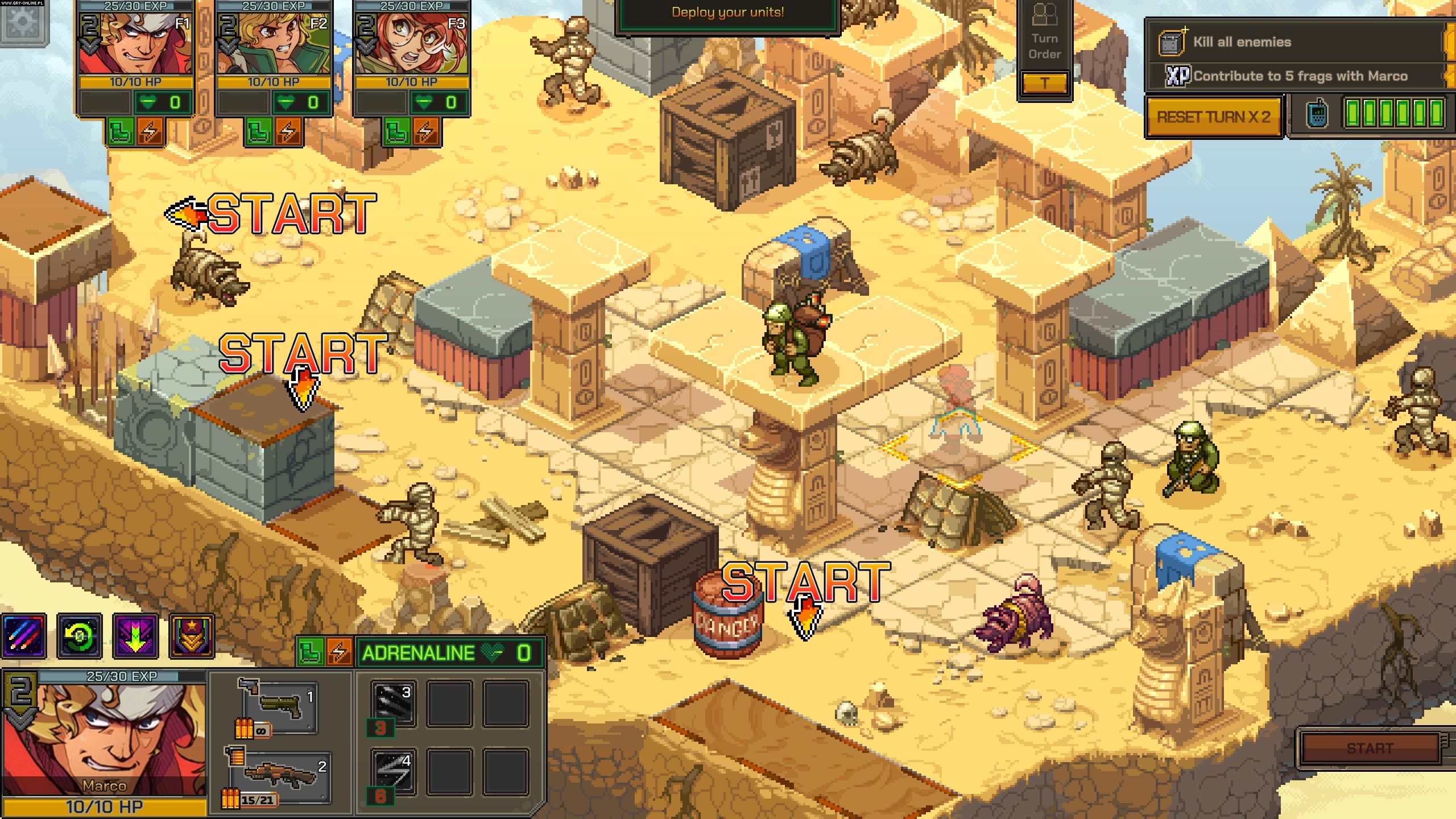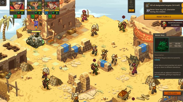 Metal Slug Tactics na najniższym poziomie trudności jest w zasadzie przedłużonym samouczkiem, który nie powinien nikomu sprawić większych trudności. Należy traktować go jako wprowadzenie do mechanik gry, ponieważ tych nie brakuje – mamy tu np. ograniczoną amunicję do broni specjalnych (można ją uzupełniać) czy określoną liczbę odrodzeń postaci w trakcie walki. Do tego dochodzą interaktywne obiekty na mapie (grywalny czołg), zawiłości związane z ukształtowaniem terenu oraz efekty niektórych przeciwników (np. mumii).