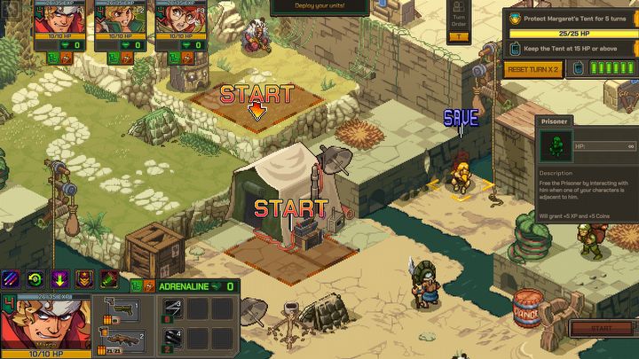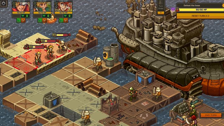 Co jeszcze? Podczas walki jesteśmy premiowani za jak najdalsze poruszanie się naszych jednostek. Zyskują one dzięki temu tymczasowe punkty życia, a także adrenalinę do wydania na umiejętności specjalne. Do tego mogą chować się za osłonami, które dodatkowo zwiększają ich przeżywalność. Całość uzupełnia system synchronizacji, znany z serii Disgaea, stawiający na pozycjonowanie jednostek. W Metal Slug Tactics sterujemy tylko trzema postaciami i jeśli dobrze je ustawimy, wykonają łączony atak na dany cel, praktycznie anihilując oponenta.