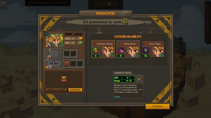 Metal Slug Tactics to roguelite, więc zapomnijcie o pełnoprawnej kampanii fabularnej. Prosta historia jest tutaj wymówką, by uczestniczyć w następujących po sobie walkach w czterech różnych regionach – starcia te zawsze kończą się pojedynkiem z bossem. Staramy się przejść całość lub dotrzeć jak najdalej, a gdy wszyscy z drużyny polegną, rozpoczynamy zabawę od nowa.