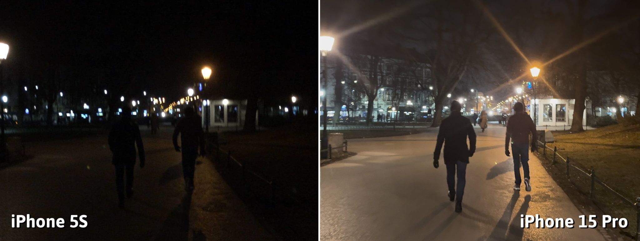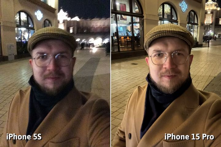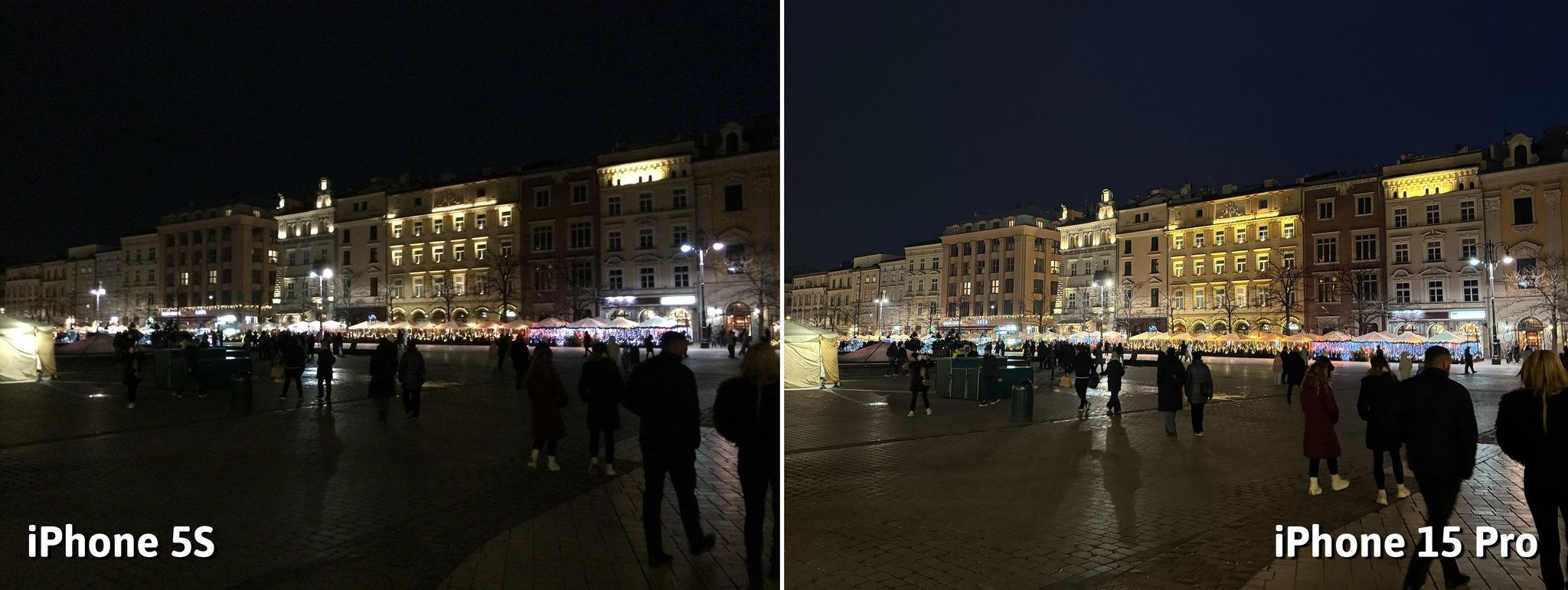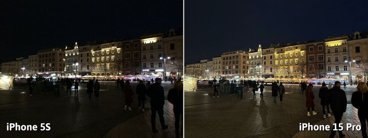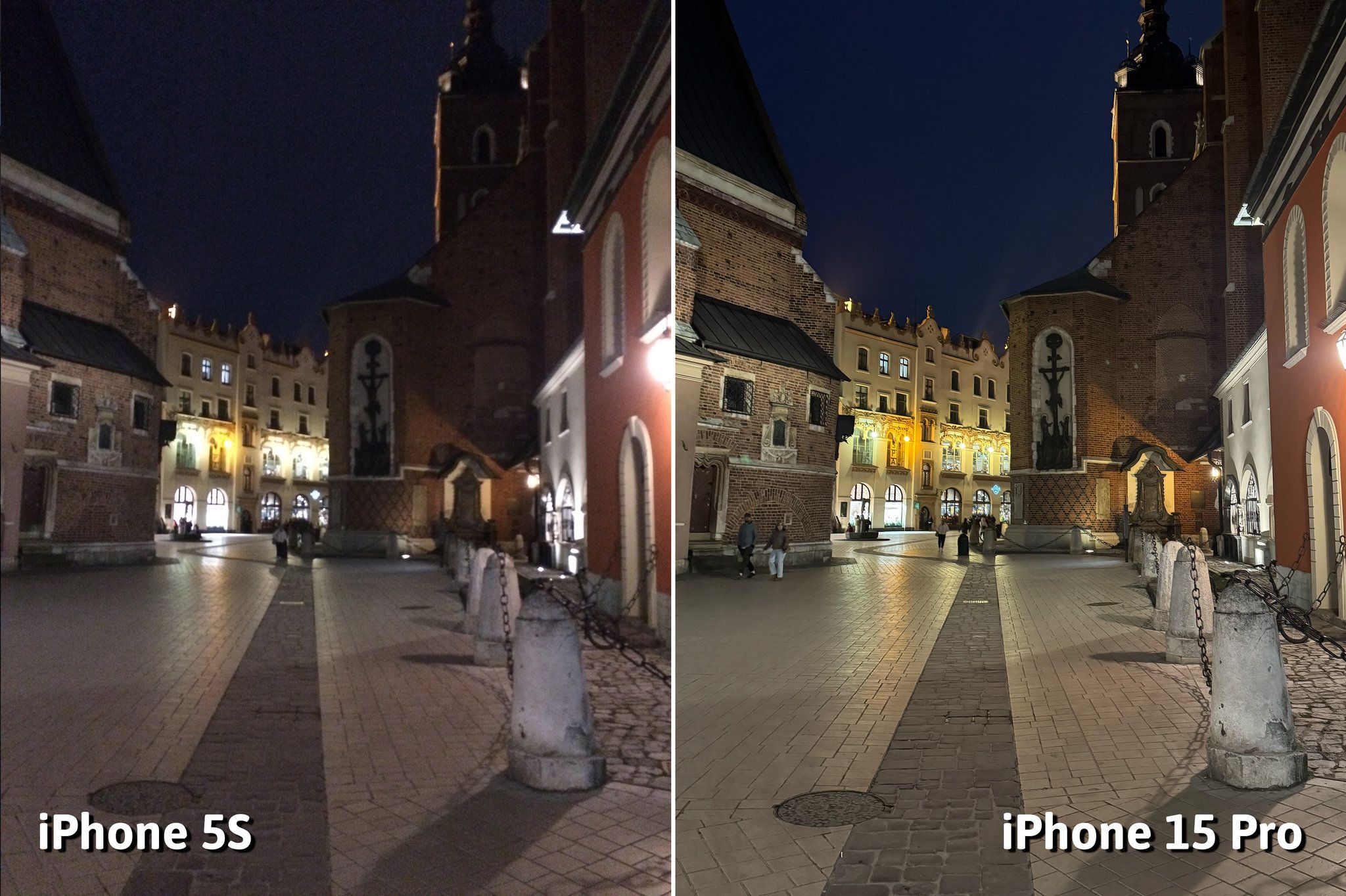 Sytuacja diametralnie się jednak zmienia, kiedy światła zaczyna brakować. Wówczas, szczególnie w nocy, zdjęcia z iPhone’a 5S wyglądają już zdecydowanie gorzej. Pojawiają się szumy, problemy z ostrością, a ilość detali spada do zastraszająco niskiego poziomu. Widać to szczególnie, kiedy zobaczymy jak dobrze w trudnych warunkach radzi sobie 15 Pro.