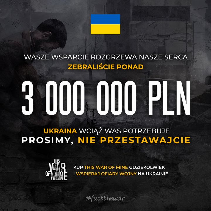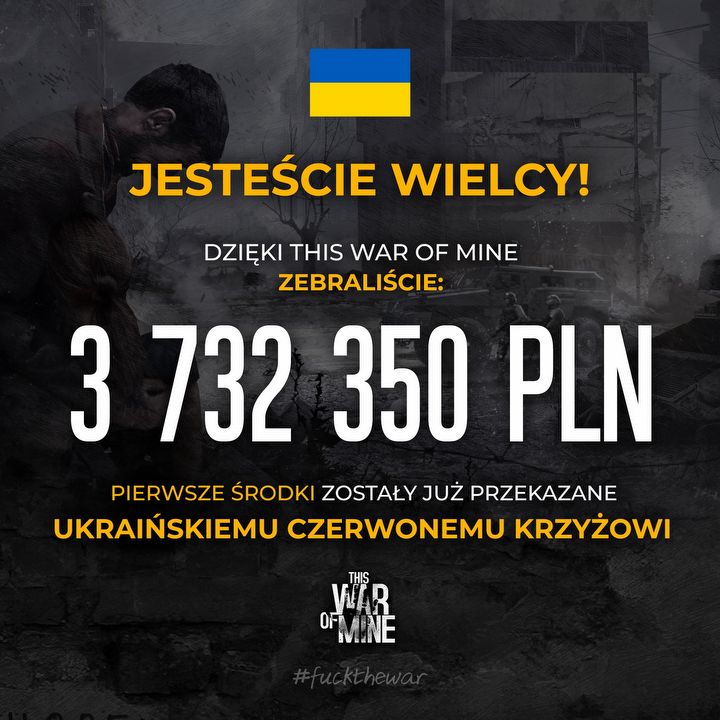 Dziś o godzinie 9:00 czasu polskiego zakończyła się akcja charytatywna zorganizowana przez rodzime 11 bit studios. Dzięki wsparciu graczy kupujących This War of Mine do Ukraińskiego Czerwonego Krzyża trafi w sumie 3 732 350 zł. Część tej kwoty została już przekazana, a deweloper dziękuje i zachęca do udzielania dalszej pomocy ofiarom wojny.