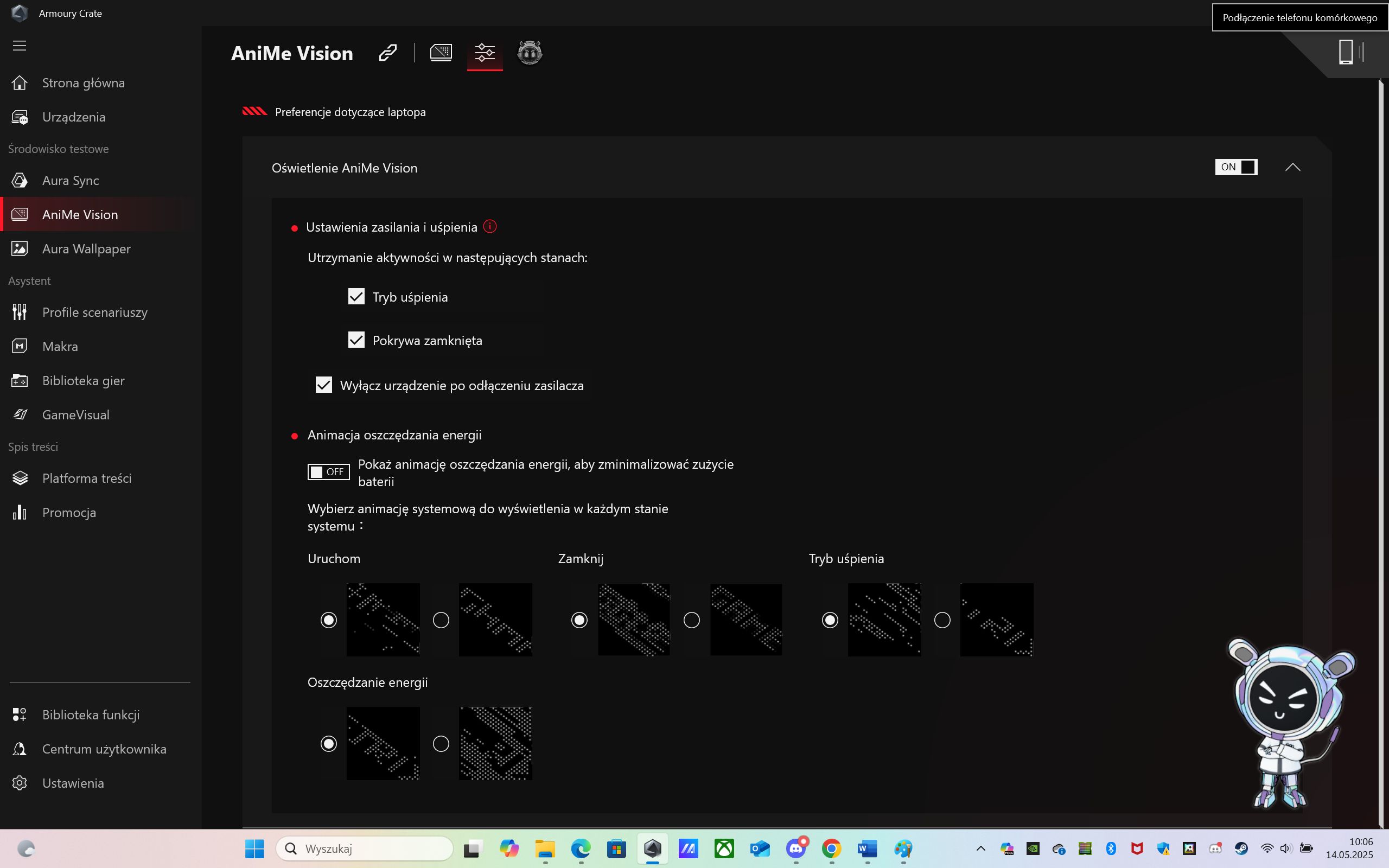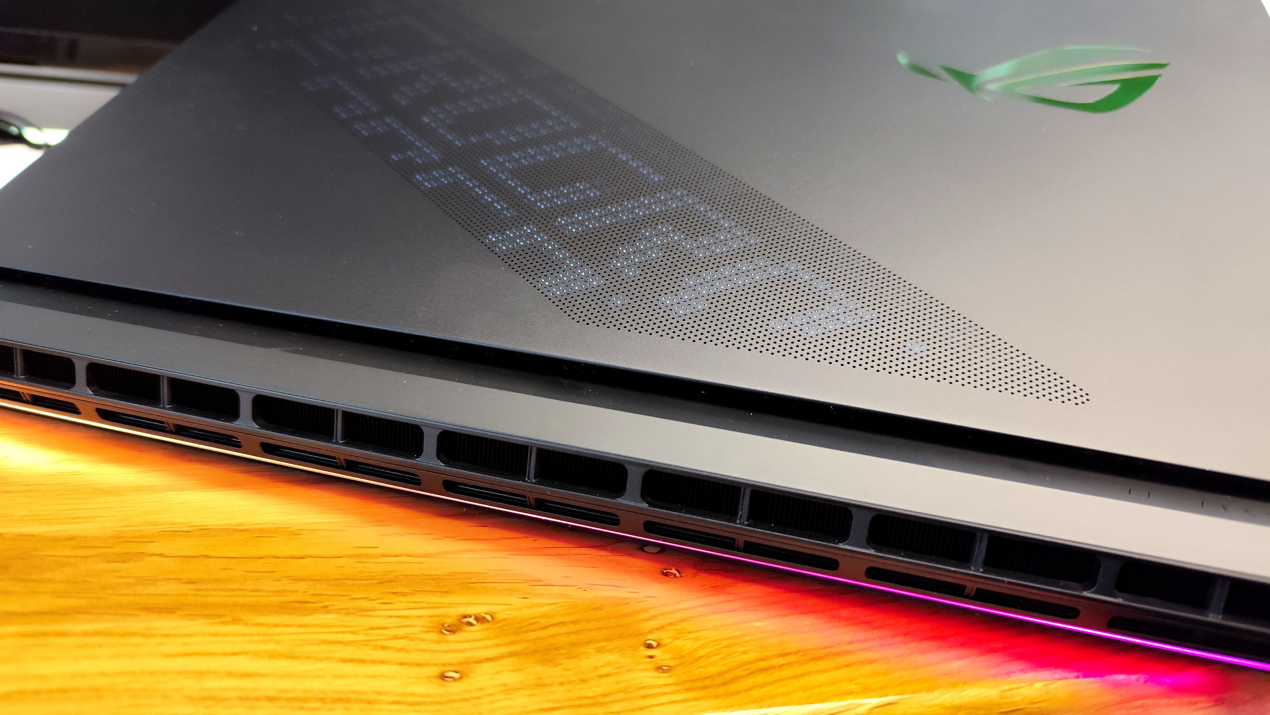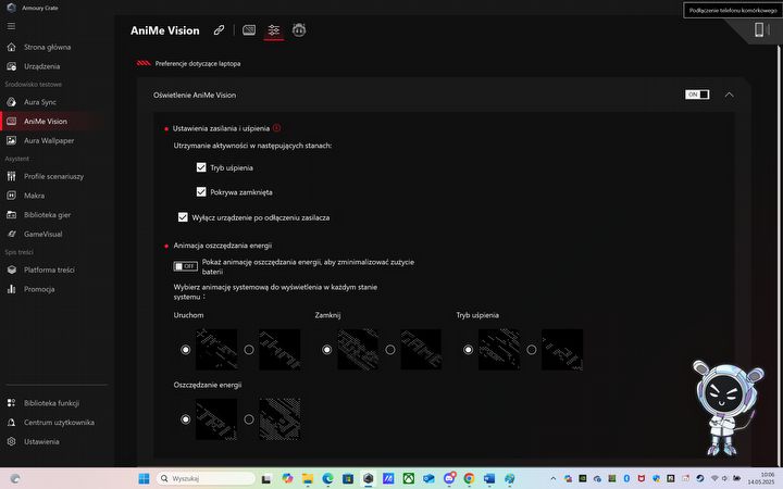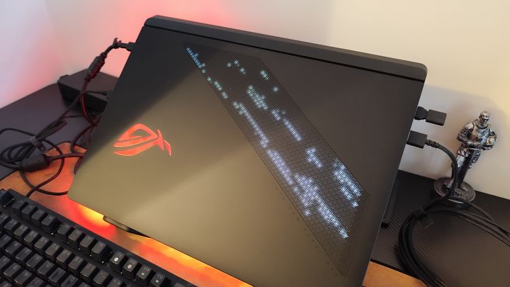 Na klapie znajduje się AniMe Vision, czyli matryca złożona z tysięcy miniaturowych diod LED umieszczonych na pokrywie laptopa. Umożliwia ona wyświetlanie spersonalizowanych animacji, tekstów, wizualizacji dźwięku oraz informacji systemowych, takich jak poziom naładowania baterii czy powiadomienia. To przyjemny bajer, choć związany z tym, że urządzenie musi być cały czas podłączone do zasilania. Po jego odłączeniu wszelkie zewnętrzne światła w trybie domyślnym są wyłączane razem z laptopem, co ma rzecz jasna pozytywnie wpłynąć na wydajność baterii.