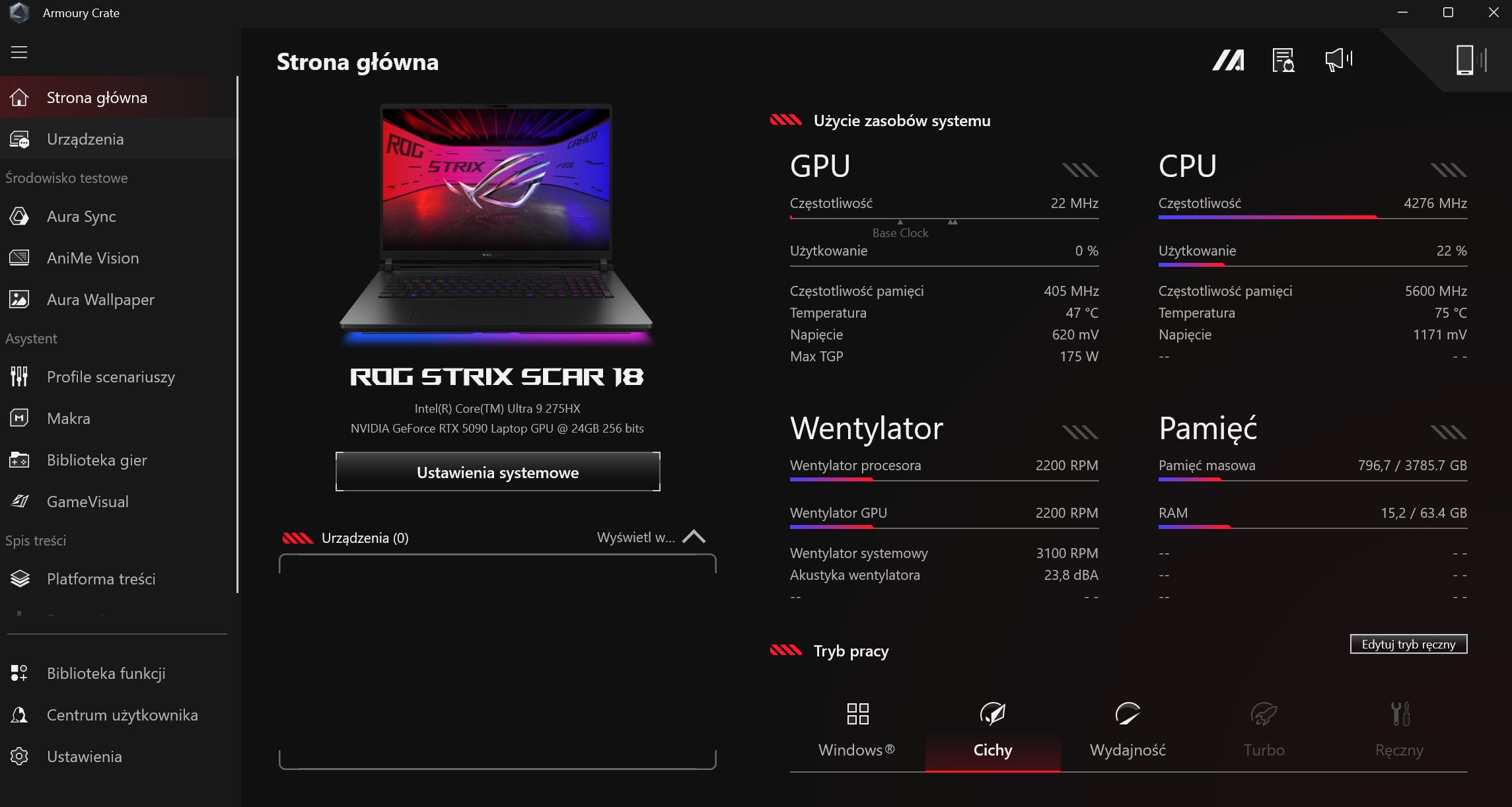 ASUS przygotował bardzo rozbudowane oprogramowanie dedykowane swoim laptopom gamingowym. Armoury Crate pozwala kontrolować niemal każdy aspekt urządzenia – od wydajności, przez wybór trybu pracy, aż po ustawienia podświetlenia czy nawet animowane tapety. Szczególnie interesująca jest możliwość synchronizacji efektów świetlnych, co z pewnością ucieszy fanów „prawdziwie gamingowych” konfiguracji.