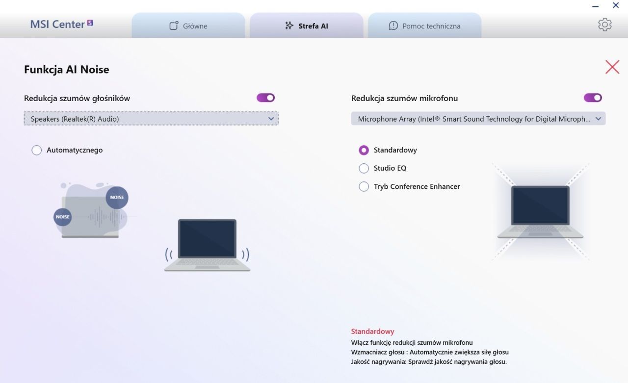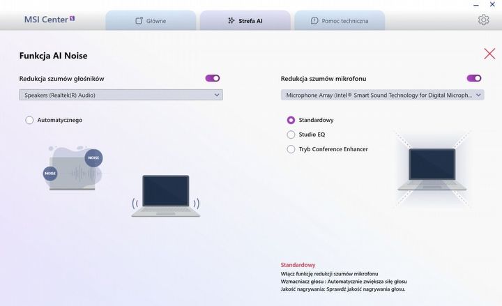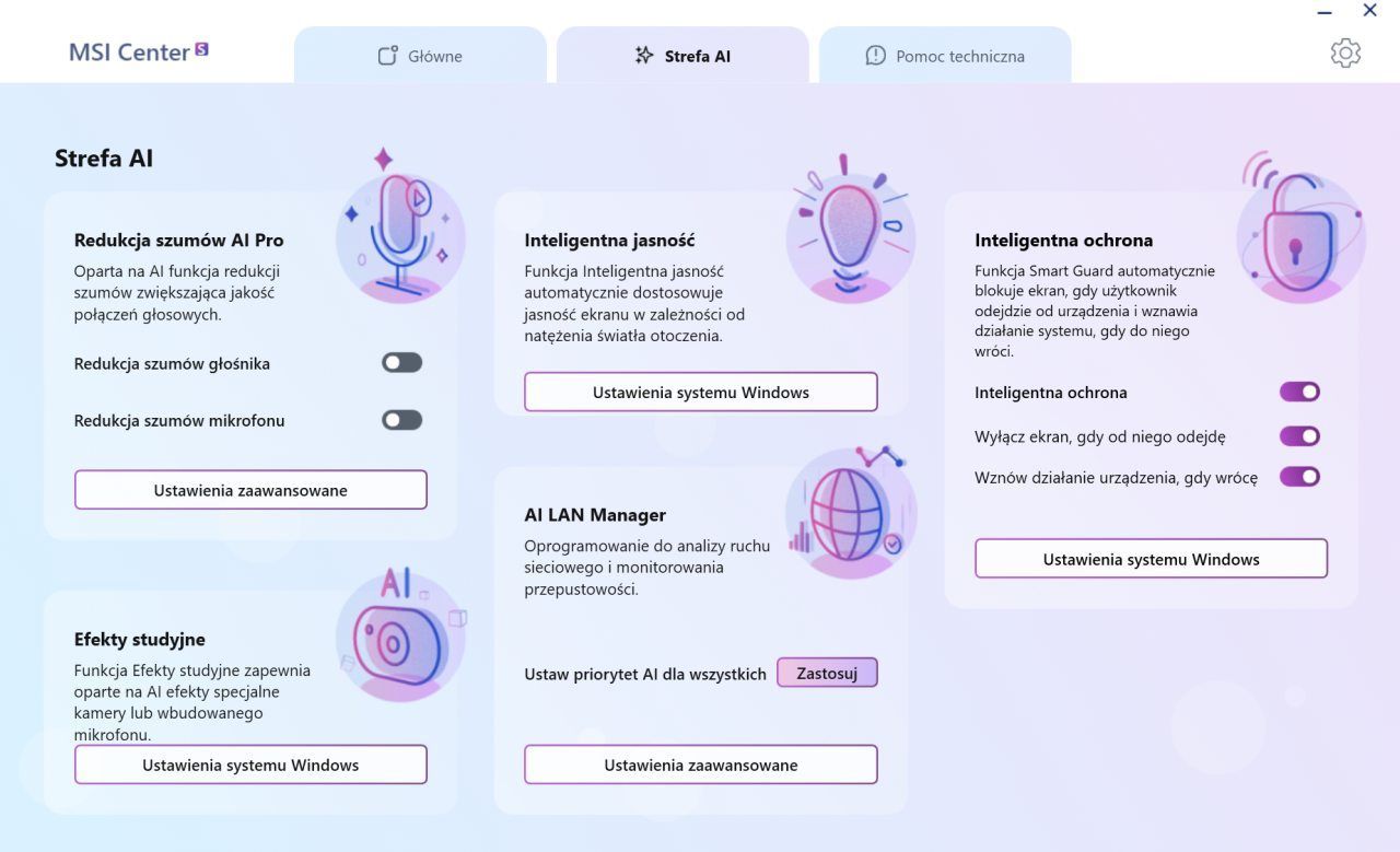 Dodatkowym argumentem są kwestie zabezpieczeń – MSI Center posiada wbudowanego Smart Guarda, który wykorzystuje potencjał AI w celu zabezpieczenia naszego komputera przed niechcianym wykorzystaniem. Usługa ta automatycznie blokuje ekran, gdy użytkownik od niego odejdzie. Działa także w drugą stronę – gdy urządzenie wykryje, że ponownie z niego korzystamy, odblokuje się natychmiast po rozpoznaniu naszej twarzy. To świetne rozwiązanie, zwłaszcza gdy działamy w open space czy lubimy popracować poza strukturami naszej firmy, np. w trakcie przerwy na kawę w ulubionej kawiarni.