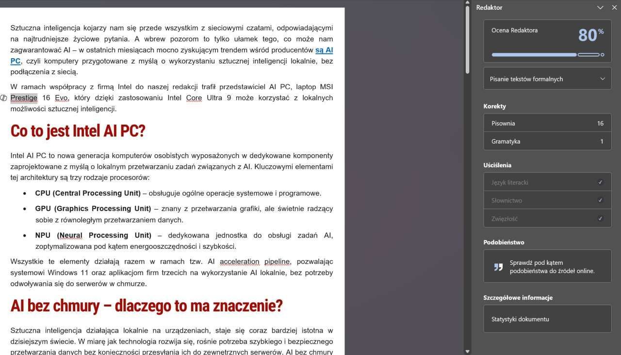 Zintegrowane funkcje AI w aplikacjach pakietu Microsoft 365, takich jak Outlook czy Word, mogą oferować inteligentne podpowiedzi tekstowe, poprawki stylistyczne lub automatyczne streszczenia wiadomości. NPU w komputerze Intel AI PC analizuje treść lokalnie i błyskawicznie proponuje lepsze sformułowania lub ton wypowiedzi dopasowany do kontekstu. I jest to o tyle świetne, że nie wrzucamy swoich treści w sieć, więc pisząc recenzję z nałożonym embargo czy wysyłając poufne wiadomości do przełożonych, nie musimy się martwić o potencjalne wycieki. Poza tym pod ręką zawsze mamy AI pozwalające w dodatkowy sposób zweryfikować informacje, gdy chcemy się upewnić, czy przekazywana przez nas treść jest zgodna z prawdą.