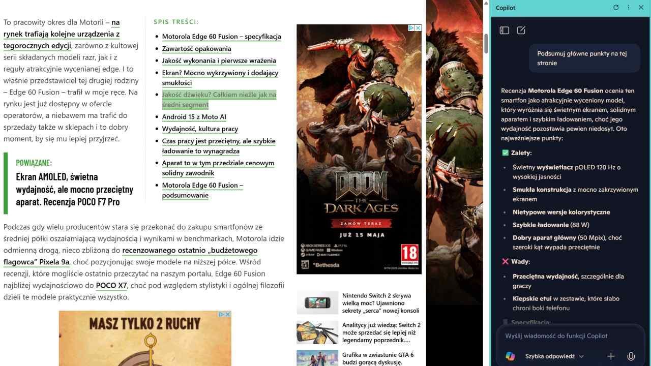 Z lokalnych rozwiązań AI korzysta także przeglądarka Microsoft Edge – oferuje ona nie tylko tłumaczenie zagranicznych stron za pośrednictwem Copilota, ale także podsumowanie artykułów, które aktualnie czytamy. Robi to całkiem sprawnie oraz wskazuje najważniejsze zagadnienia, co jest przydatne, gdy akurat potrzebujemy szybko coś zweryfikować, a nie zagłębiać się w lekturze.