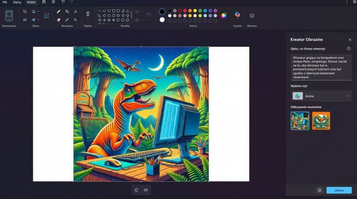 Nie ukrywam, że jedna z moich ulubionych opcji to generowanie obrazków lub usuwanie tła za pośrednictwem Painta uzbrojonego w rozwiązania AI. Pozytywnie zaskakuje zwłaszcza to drugie, bo i też działa naprawdę nieźle. Co do kreowania obrazków, tu wciąż pozostaje pewne pole do poprawy, ale już teraz program oferuje aż 8 różnych stylów oraz dowolność w doborze treści.