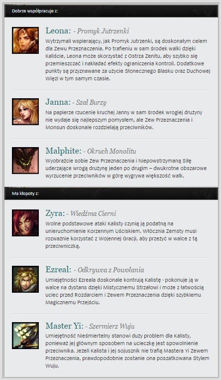 Poniżej znajdziecie jeszcze informacje, z kim Kalista dobrze współpracuje, oraz z kim może mieć poważne problemy. Natomiast wszystkie szczegóły, wraz z krótką prezentacją, znajdziecie na oficjalnej stronie.