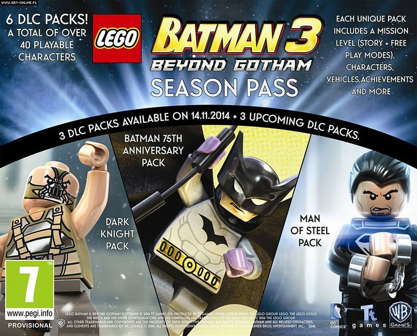 Gra LEGO Batman 3: Poza Gotham będzie pierwszą odsłoną z klockowej serii, która otrzyma przepustkę sezonową. Studio Traveller’s Tales ujawniło, że do tytułu pojawi się w sumie sześć dodatków dodających nowych bohaterów (łącznie 40), pojazdy, unikalne misje oraz osiągnięcia. Pierwsze trzy rozszerzenia nazywające się The Dark Knight Pack, Man of Steel Pack i Batman 75th Anniversary Pack pojawią się jeszcze w dniu premiery gry, czyli 14 listopada. Season Pass ma kosztować 12,79 funtów (około 65 zł). Oczywiście każdy dodatek będzie można kupić osobno w cenie 2,55 funtów (około 13 zł). Przepustkę nabędą gracze na PlayStation 3, PlayStation 4, Xboksie 360, Xboksie One oraz komputerach osobistych. DLC nie będą dostępne na konsolach firmy Nintendo i PlayStation Vita.