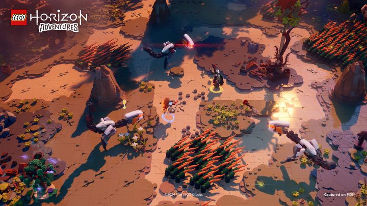 Do walki dochodzi głównie na predefiniowanych arenach. Grając jako Aloy, miałem do dyspozycji łuk, którym można strzelać szybko i na ślepo lub stanąć w miejscu i wycelować w konkretny obiekt. Wrogie maszyny pokryte są słabymi punktami, których niszczenie zadaje większe obrażenia. Na arenach rozmieszczono również wybuchowe beczki, które można podnosić i ciskać nimi we wrogów. Spotkałem również wrogo nastawionych ludzi, których... także można podnosić, by nimi rzucać. To ogromny plus LEGO Horizon Adventures – jak wszyscy wiemy, w żadnej grze nie ma większej przyjemności nad podniesienie wroga i ciśnięcie nim w przepaść, ogień, pułapkę, kolce lub innego wroga. Ten prosty, choć sprawiający frajdę, system urozmaicają nieco specjalne bronie i wihajstry oraz zbieranie przedmiotów o limitowanej liczbie użyć. Są to np. łuk obszarowy strzelający kilkoma strzałami naraz, łuk ognisty podpalający wrogów, buty odrzutowe pozwalające na podwójny skok, wózek z hot dogami rozrzucający wokół bezmięsne, za to trotylowe parówki czy ogromna maczuga wgniatająca wrogów w glebę. W testowanym przeze mnie fragmencie gry wihajstrów było dość sporo, co zapobiegało potencjalnej monotonii i utrzymywało moją uwagę. W grze jest też system doświadczenia zdobywanego za pokonywanie nieprzyjaciół i kończenie poziomów – każdy level up nagradza z góry predefiniowaną premią, taką jak większa ilość zdrowia lub zwiększone obrażenia.