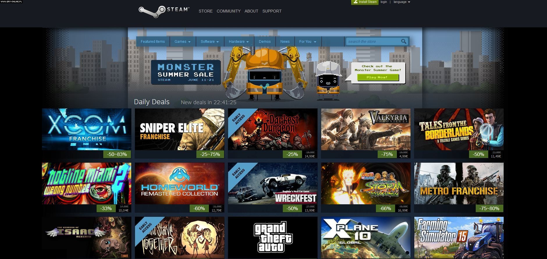 Zgodnie z przeciekami i nieoficjalnymi informacjami, które krążyły po sieci od kilku tygodni, ruszyła właśnie letnia wyprzedaż w serwisie Steam, która trwać będzie do 21 czerwca. Tradycyjnie gracze mogą liczyć na całą gamę różnych promocji i przecen. Oferowane zniżki wahają się zazwyczaj w granicach 50-75%. Większe i mniejsze upusty dotknęły znaczną część steamowego katalogu. Promocje przygotowane przez Valve dzielą się na dwa podstawowe rodzaje: oferty dnia (zmieniające się co dobę o godzinie 19:00), błyskawiczne oferty (aktualizowane co 12 godzin – codziennie o 7:00 i 19:00 czasu polskiego), a także specjalne zniżki, które zależeć będą od postępów użytkowników serwisu w okolicznościowej grze przeglądarkowej Monster Summer Game.
