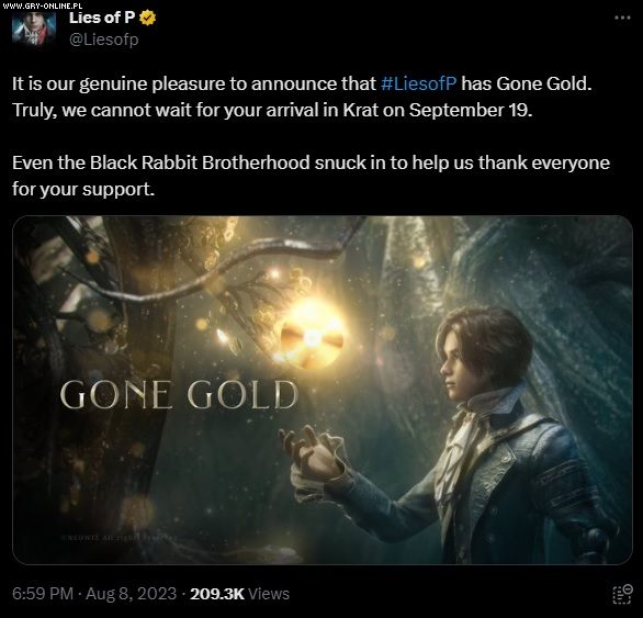 Firma Neowiz oraz zespół Round8 Studio ogłosiły, że ich najnowsza produkcja, czyli gra RPG akcji pod tytułem Lies of P, osiągnęła „złoty” status. Oznacza to, że prace nad tym projektem dobiegły końca i jest on gotowy do premiery.