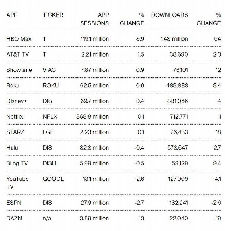 Tabelka ilustrująca popularność platform streamingowych w okresie 18-28 marca 2021. Źródło: Bloomberg