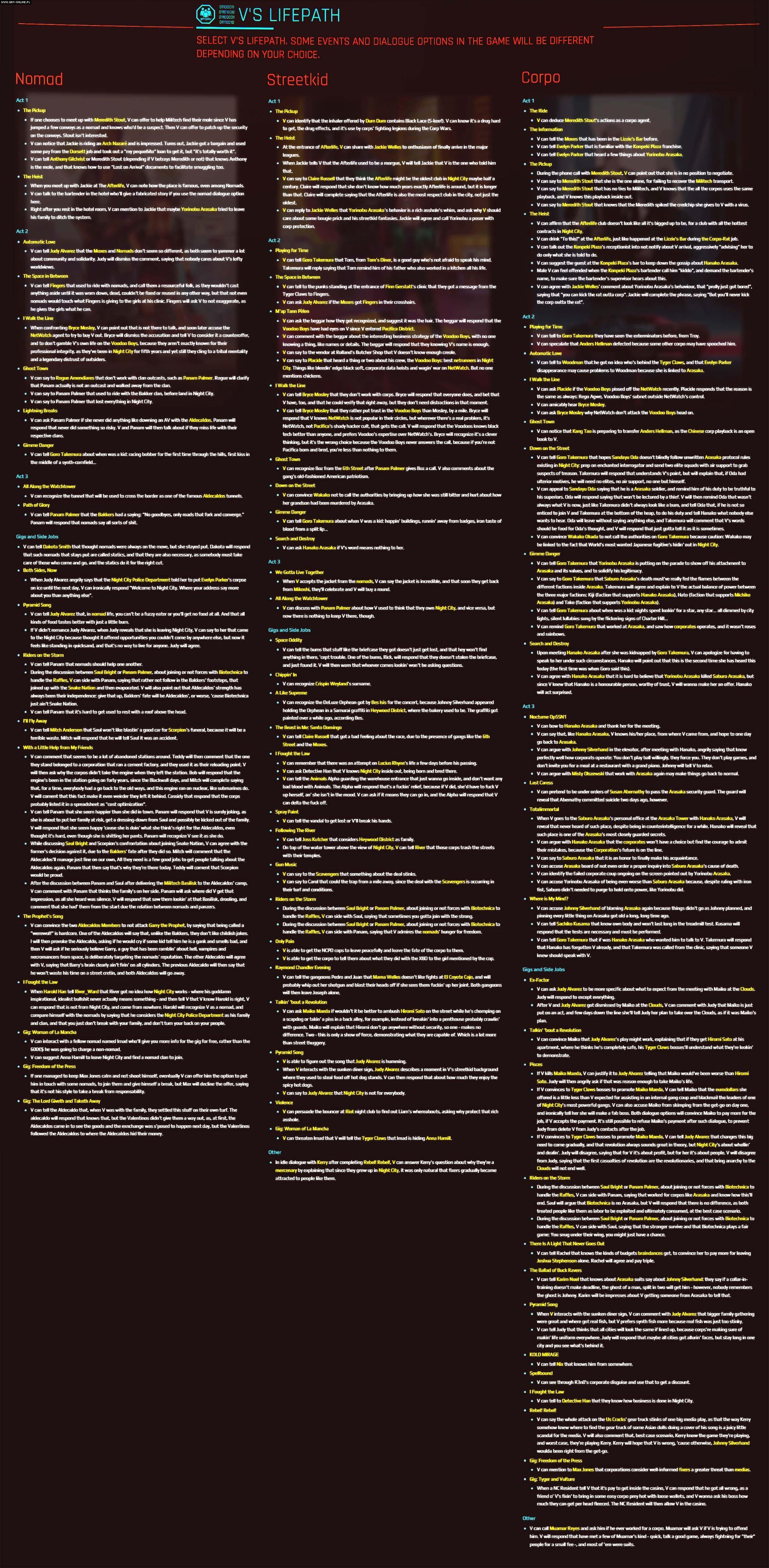 Jeden z fanów gry CD Projekt RED postanowił zebrać specjalne opcje dialogowe każdej ścieżki i porównać je ze sobą. Efektem jest imponujące zestawienie, prezentujące dziesiątki wariantów rozmów zależnych od pochodzenia V. Daje ono przy tym prawdopodobną odpowiedź na wcześniejsze pytanie.