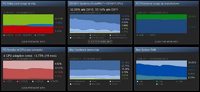 Na Steamie pojawiły się listopadowe wyniki badania sprzętu użytkowników, które platforma przeprowadza regularnie. Dzięki temu uzyskaliśmy wgląd w to, z jakiego sprzętu korzystają posiadacze komputerów PC oraz Mac i jak zmienia się popularność poszczególnych konfiguracji, czy produktów. Z sondy wynika, że już ponad 53% fanów platformy Valve ma sprzęt kompatybilny z DirectX 11, a najczęściej występującą kartą jest GeForce GTX 560 Ti.