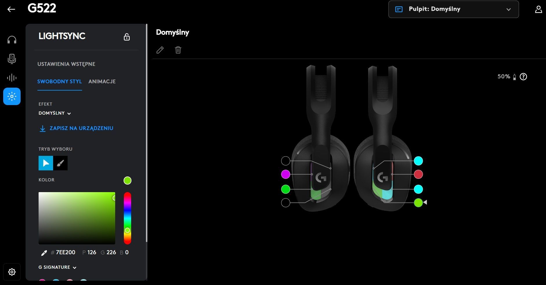Za pomocą aplikacji możemy sobie dostosować podświetlenie LIGHTSYNC RGB, wybierając spośród 16.8 miliona kolorów i konfigurując efekty dla ośmiu niezależnych stref. To fajne rozwiązanie, można się nim pobawić, choć z drugiej strony – my, jako użytkownicy, tego podświetlenia raczej nie widzimy podczas noszenia słuchawek. Chyba, że w ekranie, bo - zwłaszcza wieczorami - wydobywające się z nich światło odbijało się w monitorze, mnie to bardzo rozprasza. Rozumiem jednak, że komuś taki bajer może się podobać.