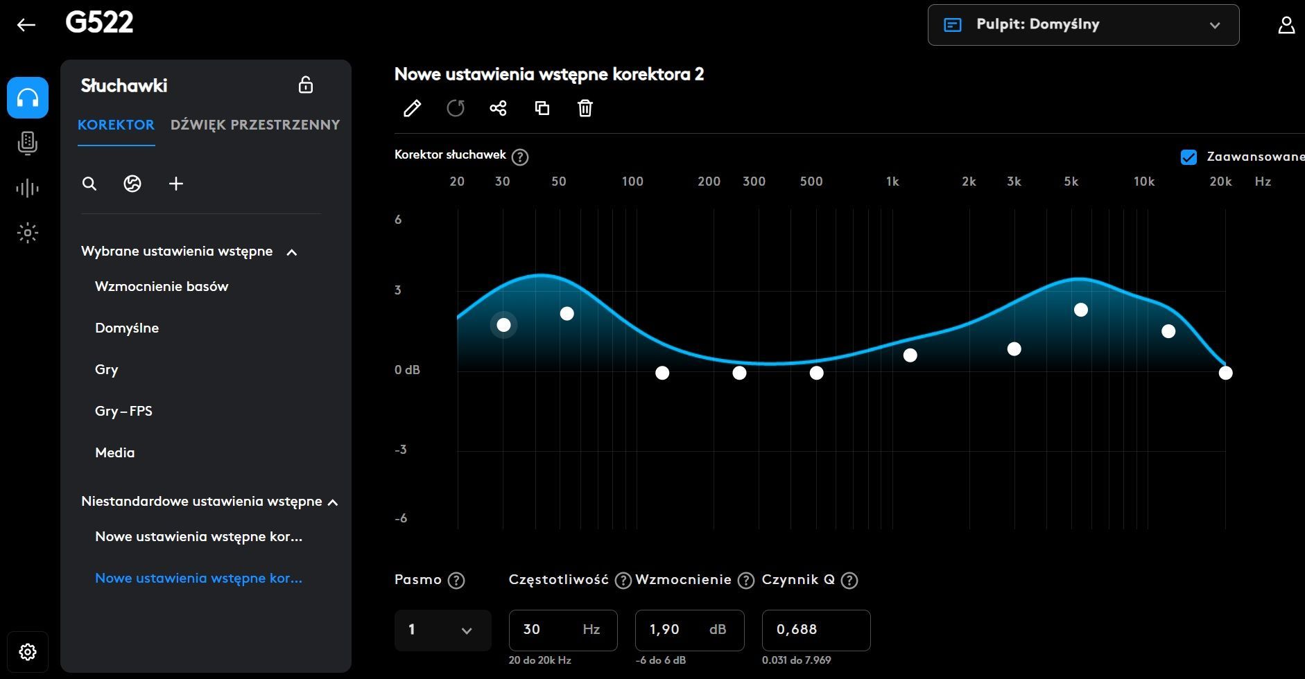 Oprogramowanie umożliwia również zaawansowaną korekcję dźwięku dzięki 10-pasmowemu korektorowi graficznemu i to jest dla mnie (generalnie sama idea equalizera) gamechanger. O ile jakość dźwięku jest (uwaga, spojler) bardzo dobra, to musiałem nieco „podkręcić” go pod swoje preferencje. Oczywiście inne mam do muzyki, a inne do grania, dzięki czemu swoje zastosowanie świetnie odnajdują profile. Te można modyfikować, zapisywać i tez dzielić się ze społecznością.