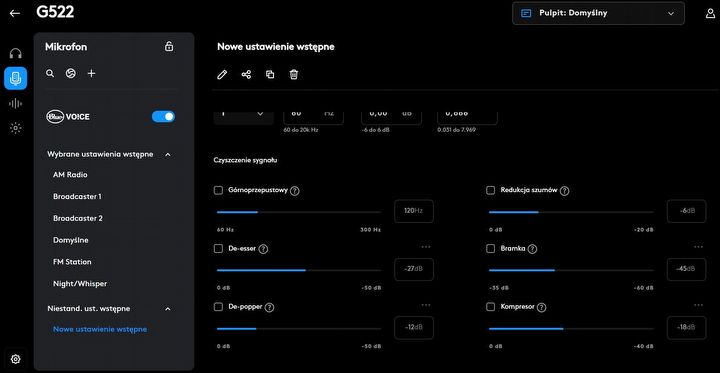Kluczową funkcją G HUB w kontekście G522 jest obsługa technologii BLUE VO!CE dla mikrofonu. Tutaj dostroimy brzmienie swojego głosu, korzystając z opcji takich jak regulacja wzmocnienia, korektor mikrofonu czy funkcje czyszczenia sygnału. Te ostatnie są imponujące, bo mamy tu do dyspozycji np. kompresor, redukcję szumów czy de-esser (usuwa szeleszczące głoski). I tak samo tutaj mamy do dyspozycji profile.