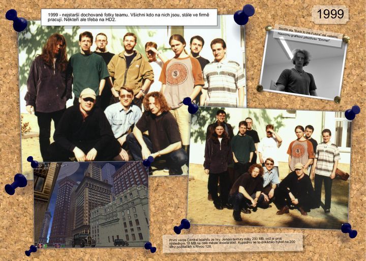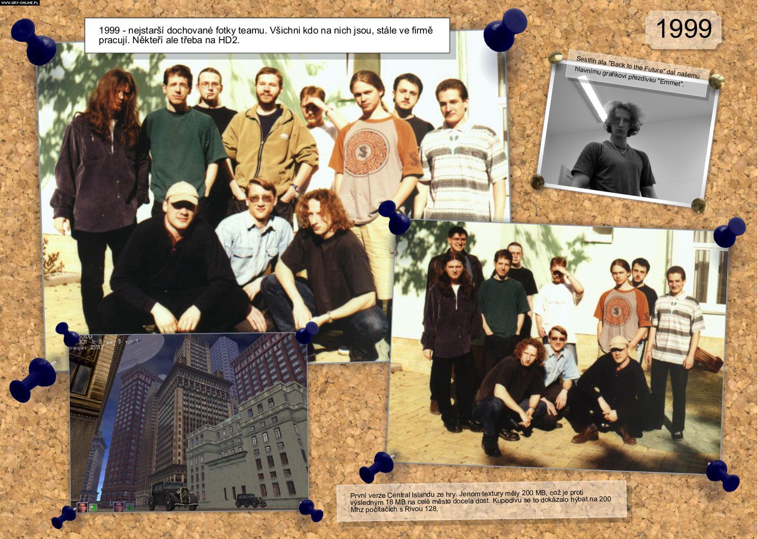 Zdjęcie zespołu deweloperskiego Illusion Softworks z 1999 roku wraz z pierwszym screenem z gry Mafia. Wtedy produkcja działała jeszcze na silniku Hidden and Dangerous.