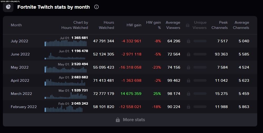 Spadek formy widać także po innych statystykach. W lipcu użytkownicy Twitcha obejrzeli niecałe 48 miliony godzin transmisji z Fortnite’a. To pierwszy raz w tym roku, kiedy oglądalność dzieła studia Epic Games spadła poniżej 50 mln godz., a pierwsza połowa 2022 r. bynajmniej nie należała do najlepszych w historii gry.