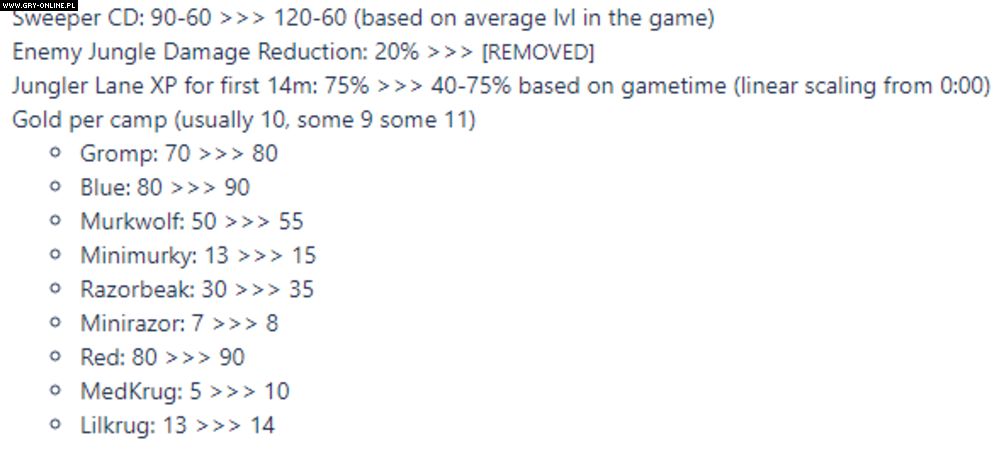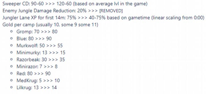 Ponadto testowane rozwiązania mają sprawić, że wczesne ganki mają stać się nieco mniej uciążliwe. Czyszczenie dżungli ma stać się bardziej opłacalne, co ograniczy liczbę wczesnych ganków oraz poprawi wizję drużyn w leśnych zaroślach.
