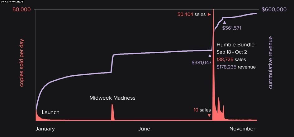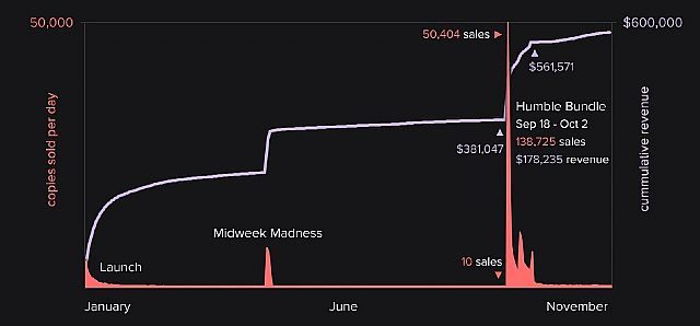 Prawdziwy rozkwit gra przeżyła jesienią, gdy sprzedawano ją w ramach szóstej edycji Humble Bundle. Od 18 września do 2 października na Steamie zarejestrowano niemal 139 tysięcy egzemplarzy, co przyniosło twórcom jakieś 153 tysiące dolarów. Po zakończeniu promocji, wzrosła także popularność gry na Steamie – dzienna sprzedaż podskoczyła z kilku do kilkudziesięciu sztuk.